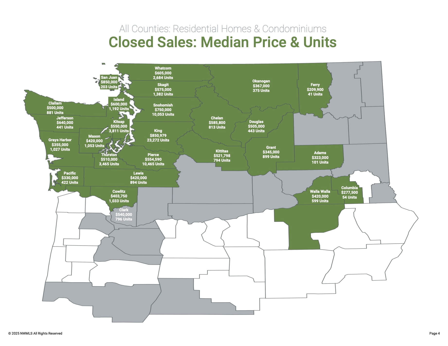 Overall, the median price for residential homes and condominiums sold in March 2025 was $649,999, representing a 2.6% increase from March 2024 ($633,717). The three counties with the highest median sale prices were San Juan ($870,000), King ($855,000), and Snohomish ($755,000), and the three counties with the lowest median sale prices were Columbia ($220,000), Ferry ($268,725), and Grays Harbor ($335,100).