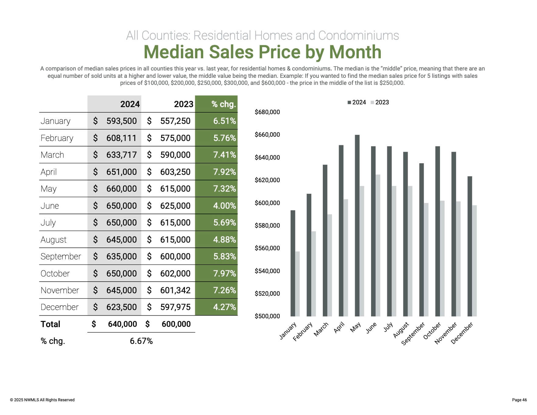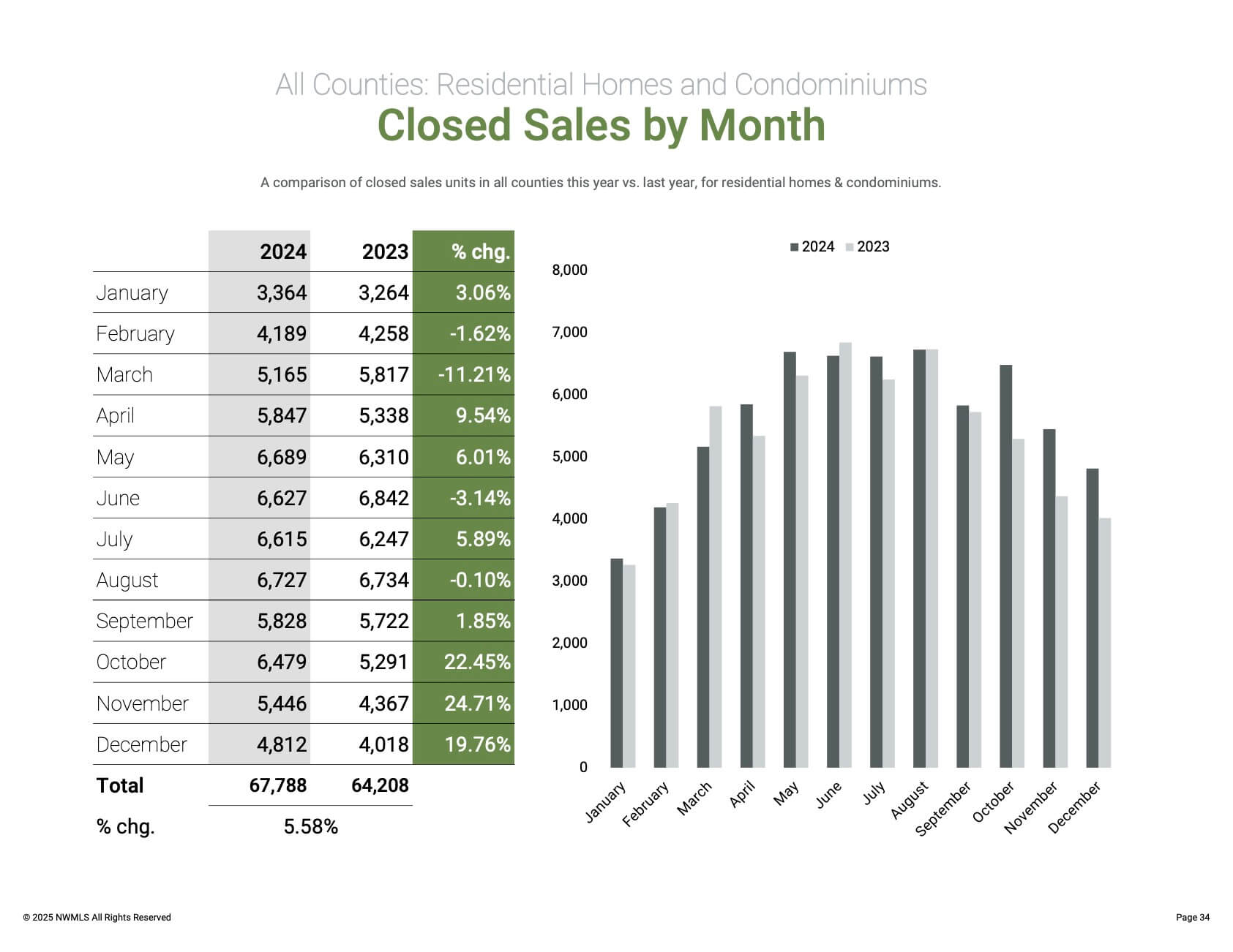 Northwest MLS members reported 67,788 sales of residential homes and condominiums during 2024. The total closings were valued at more than $54 billion. Residential homes account for nearly 87% of the total sales, and condominiums make up the approximate remaining 13%. Compared to 2023, there were 3,580 more sales in 2024, an increase of 5.58%. This was a slight uptick compared to 2023, with total closings at 64,208 and sales value at just under $48 billion.