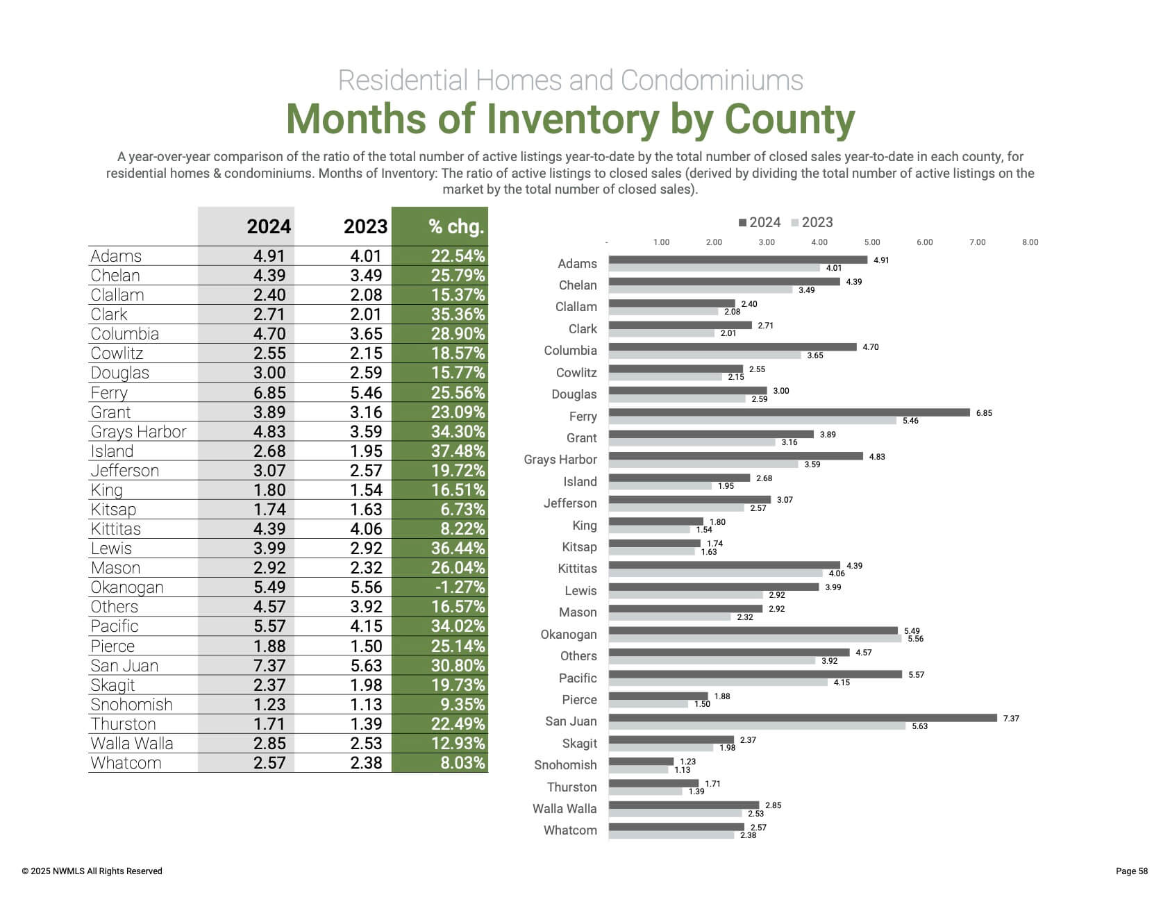 On a year-over-year basis, the number of homes for sale increased throughout the NWMLS coverage area. All but counties experienced a double-digit increase.