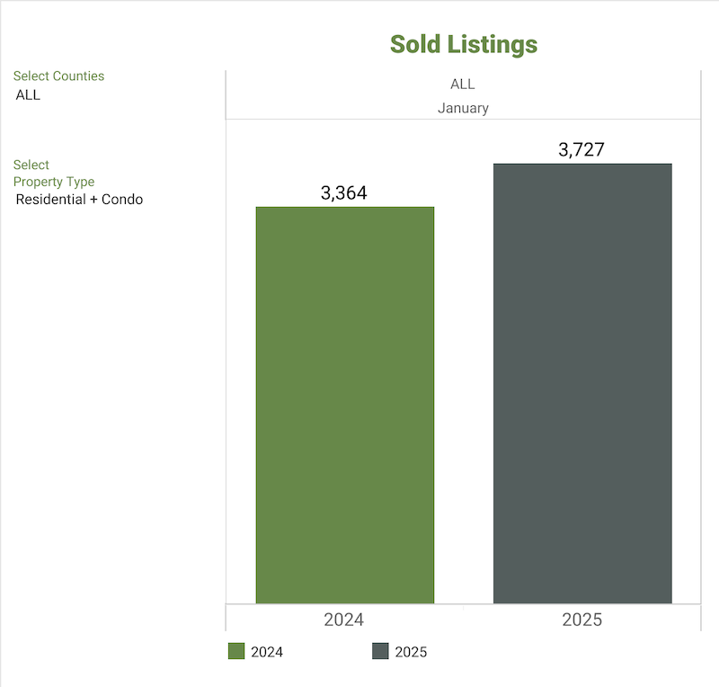 3,727 residential homes and condominium units were sold in January 2025, an increase of 10.8% compared to January 2024 (3,364). The total dollar value of closed sales in January 2025 for residential homes was $2,471,486,679 and $377,558,816 for condominiums ($2,849,045,495 in total), an increase of 17.4% when compared to January 2024.