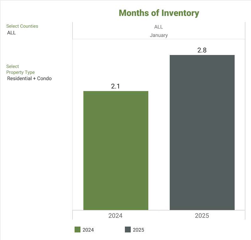 Homes listed for sale increased 44.6% year-over-year throughout the NWMLS coverage area. 22 out of 26 counties experienced a double-digit increase compared to January 2024. There were 10,241 active listings on the market at the end of January 2025 compared to 7,084 at the end of January 2024. The five counties with the highest increases in active inventory for sale were Snohomish (+96.9%), King (+62.6%), Skagit (+54.4%), Kittitas (+53.8%), and Grant (+48.8%). There are less than three months (2.75) of available inventory.