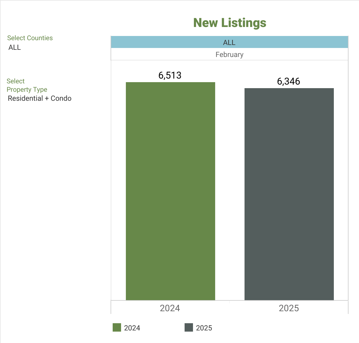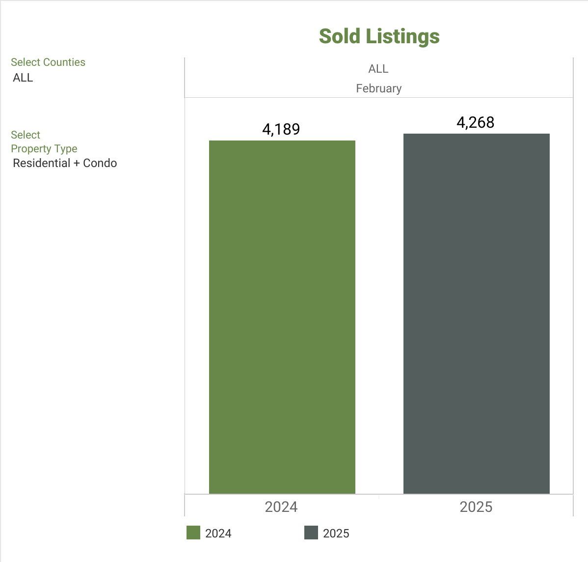 There were 4,268 closed sales of residential homes and condominium units in February 2025, an increase of 1.9% when compared to February 2024 (4,189). The total dollar value of closed sales in February 2025 for residential homes was $2,856,599,410 and $463,877,754 for condominiums ($3,320,477,164 in total), an increase of 5% when compared to February 2024.