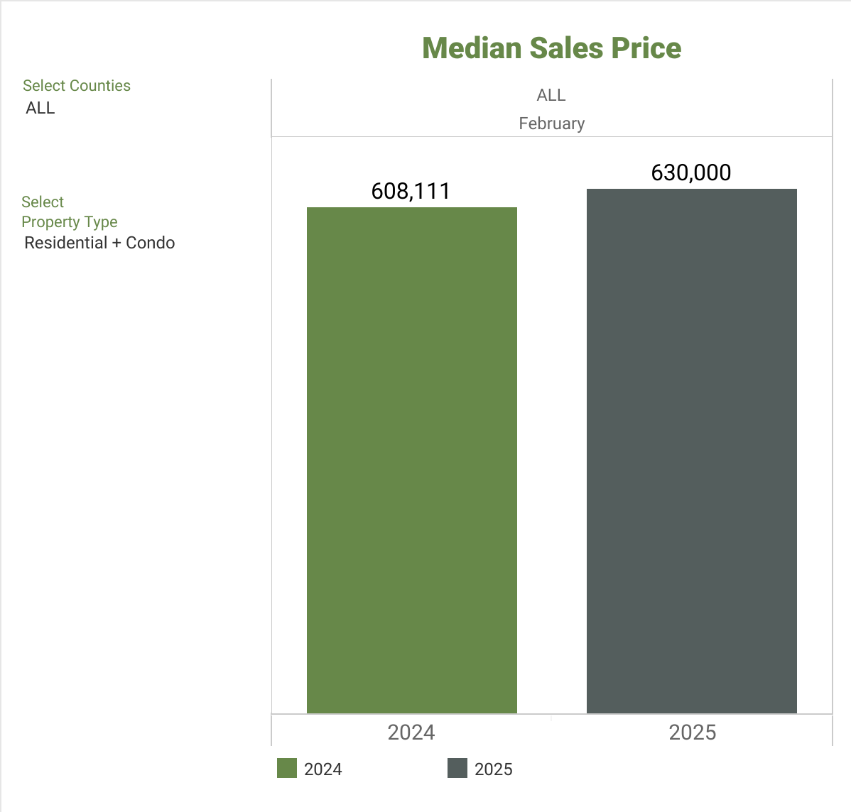 Overall, the median price for residential homes and condominiums sold in February 2025 was $630,000, an increase of 3.6% compared to February 2024 ($608,111). The three counties with the highest median sale prices were San Juan ($880,000), King ($820,000), and Snohomish ($734,975), and the three counties with the lowest median sale prices were Columbia ($224,000), Pacific $292,500), and Okanogan ($322,500).