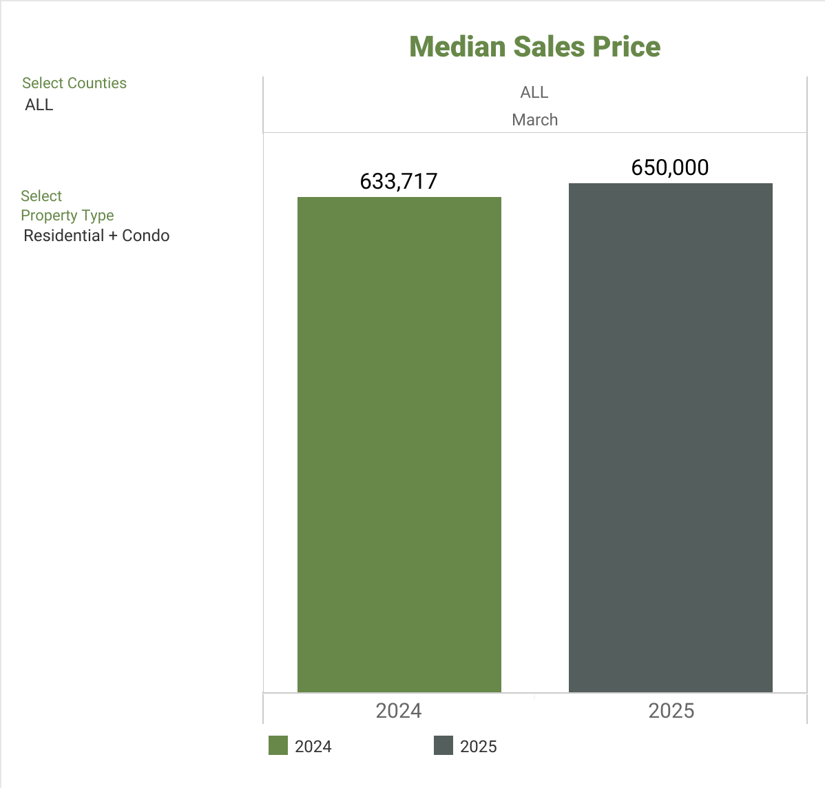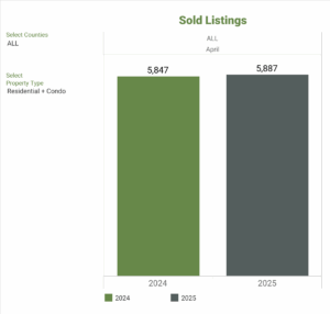 Overall, the median price for residential homes and condominiums sold in April 2025 decreased by 0.2% compared to April 2024. Compared to last month, the median price was virtually unchanged ($649,999 in March 2025).