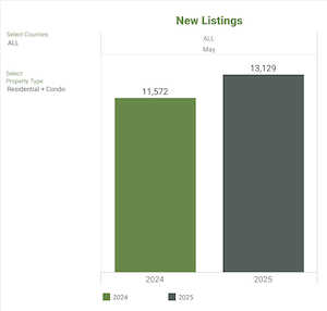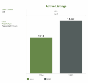 There was a 42.63% increase year-over-year in the total number of properties listed for sale in the NWMLS service area, from 12,837 in May 2024 to 18,310 active listings in May 2025, and a 26.6% increase from 14,459 active listings in April 2025.