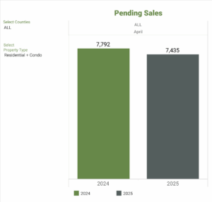 There were 6,739 residential and condo units under contract in October 2025, representing a 6.4% decrease compared to October 2024. When compared to the previous month, the number of pending listings decreased by 8.1%.