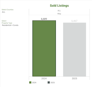 The number of closed sales decreased by 3.3% year-over-year, down from 6,689 in May 2024 to 6,467 in May 2025. When compared to the previous month, the number of closed sales increased by 9.9%, up from 5,887 sales in April 2025.