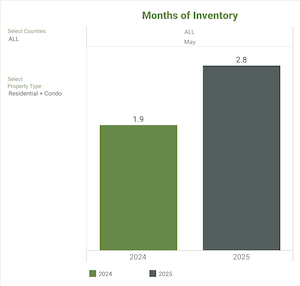 The number of closed sales increased by 1.01% year-over-year, up from 6,627 in June 2024 to 6,694 in June 2025. When compared to the previous month, the number of closed sales increased by 3.51%, up from 6,467 sales in May 2025. 13 out of 27 counties saw an increase in the number of closed sales year-over-year. The six counties with the largest increases were Adams (+55.56%), Columbia (+33.33%), Lewis (+29.73%), Kittitas (+17.53%), Douglas (+10.87%) and Mason (+7.37%). The six counties with the lowest months of inventory in June 2025 were Kitsap (2.05), Snohomish (2.12), Thurston (2.19), Pierce (2.65), King (2.72) and Skagit (2.9).
