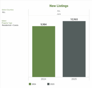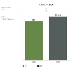 NWMLS brokers added 10,418 new listings to the database in July 2025, a year-over-year increase of 12.25% compared to July 2024 (9,281). When compared to the previous month (June 2025), new listings decreased by 4.99%, with 10,965 listings added to the NWMLS database.
