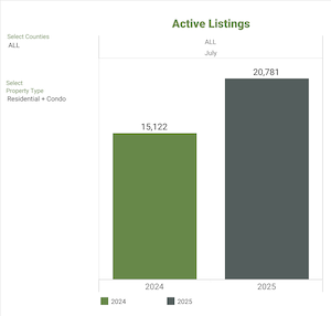 20,781 active listings on the market at the end of July 2025, compared to 15,122 at the end of July 2024 represented a 37.42% increase in the total number of properties listed for sale year-over-year, with 20,781 active listings on the market at the end of July 2025, compared to 15,122 at the end of July 2024. When compared to the previous month, active inventory increased by 944 listings (+4.76%), up from 19,837 in June 2025.