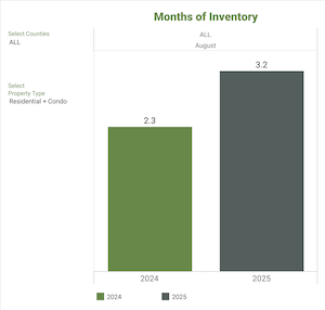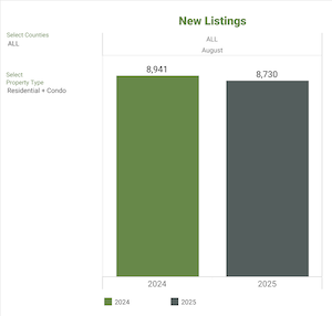 There were 20,219 active listings on the market at the end of August, compared with 15,453 from a year ago. This number represents a 30.8% increase in properties listed for sale. When compared to the previous month, active inventory decreased by 562 listings, a reduction of 2.7%, down from July 2025, when it stood at 20,781.