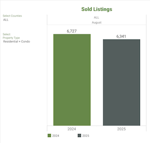 The number of closed sales was 6,341, compared to 6,727 the previous year, representing a 5.7% decrease. Compared to the last month, the number of closed sales decreased by 7.7%, down from 6,867 sales in July 2025.