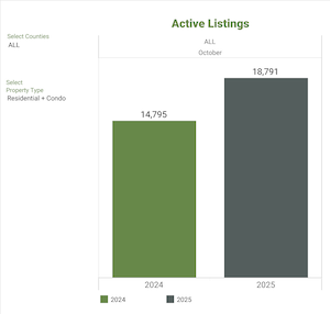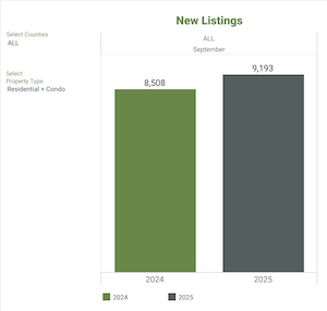 7,991 new listings were added to the market in October 2025, which reflects a 3.4% increase on a year-over-year basis. Compared to the previous month (September 2025), new listings decreased by 13.1%. When looking at the 27 individual counties in NWMLS’s primary service area, the number of new listings increased year-over-year in 20 counties and decreased year-over-year in 7 counties.