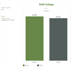 The number of closed sales decreased by 4% year-over-year, compared to the previous month. The number of closed sales increased slightly by .8%, up from September 2025.
