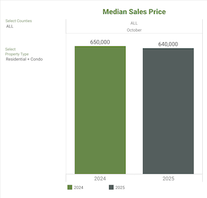 The median sales price for residential homes and condominiums sold in October 2025 decreased by 1.5% to $640,000, compared to a slight decrease of 1.5% in October 2024. There was a 1.5% increase relative to the previous month.
